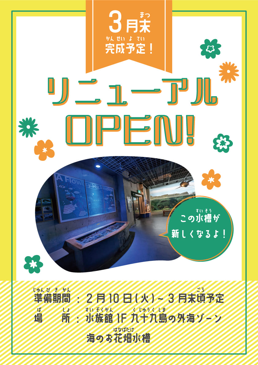 お花畑水槽リニューアル作業に伴う展示中止について(2026年2月10日~) 2026年2月7日(土) 九十九島水族館海きらら内お花畑水槽(五島の海水槽付近)では、下記の日程でリニューアル作業を実施します。 期間中は展示を中止いたしますので、ご理解とご協力の程、よろしくお願いいたします。